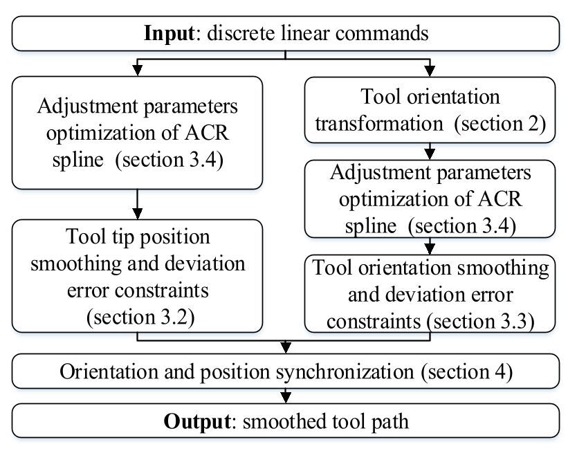 The flowchart of the developed ACR-spline-based tool path smoothing method for robotic machining system is shown in Fig. 3. In the tool path smoothing process, the maximum deviation errors of both tool tip position and orientation caused by local smoothing should be constrained. Besides, the tool tip position and orientation should be synchronized to the tool tip displacement with C3 continuity by replacing the remaining linear segments with ACR spline.