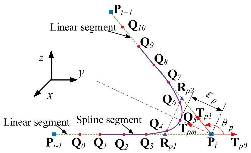 In addition, the portion of each linear segment reserved for spline insertion is strictly bounded by the segment-span constraints stated in the paper: the inserted spline occupies no more than one third of a shared linear segment (see Eqs. (16)–(17)). These analytic length bounds limit excessive local bending on short segments and therefore reduce the geometric conditions that can lead to self-intersection.