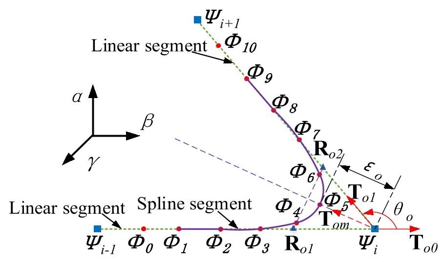 In this subsection, the tool orientation corner <Ψi-1ΨiΨi+1shown in Fig. 5 is chosen as an example to illustrate the developed tool orientation smoothing method, where Ψi-1, Ψiand Ψi+1are three end point orientations of the adjacent linear segments (expressed in the chosen Euler-angle convention). The ACR spline described in Section 3.1 is utilized to smooth the tool orientation at this transition corner under the orientation error toleranceε0. Hereε0 is an angular tolerance defined on the Euler-angle coordinates and has units of radians.
