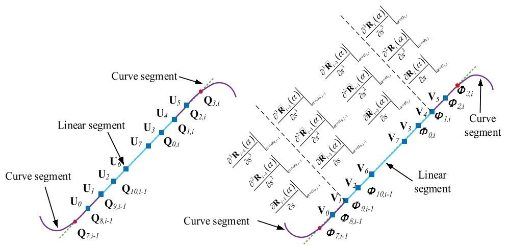 In this study, the developed ACR splines are utilized to replace the remaining position and orientation linear segments. For the sake of simplicity, the control points Q8,i-1, Q9,i-1, Q10,i-1, Q0,i Q0,i, Q1,i Q1,i and Q2,i of the two adjacent curve segments are considered as the control points of the remaining position linear segments, and rewritten as U0,U1, U2 U3,U4 and U5, as shown in Figure 8.