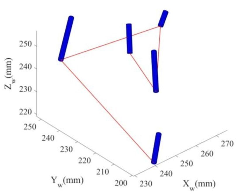 In this section, the developed ACR-spline-based C3 continuous tool path smoothing method for robotic machining is validated through numerical simulation. The test tool path used in the simulation is depicted in Fig. 9, consisting of four linear segments and three corner transitions, with the corresponding parameters listed in Tab. 1. The deviation error tolerances for the tool tip position and orientation are set as εp = 0.8 mm and ε0 = 0.01rad, respectively. The resulting smoothed tool tip position and tool orientation are illustrated in Fig. 10.