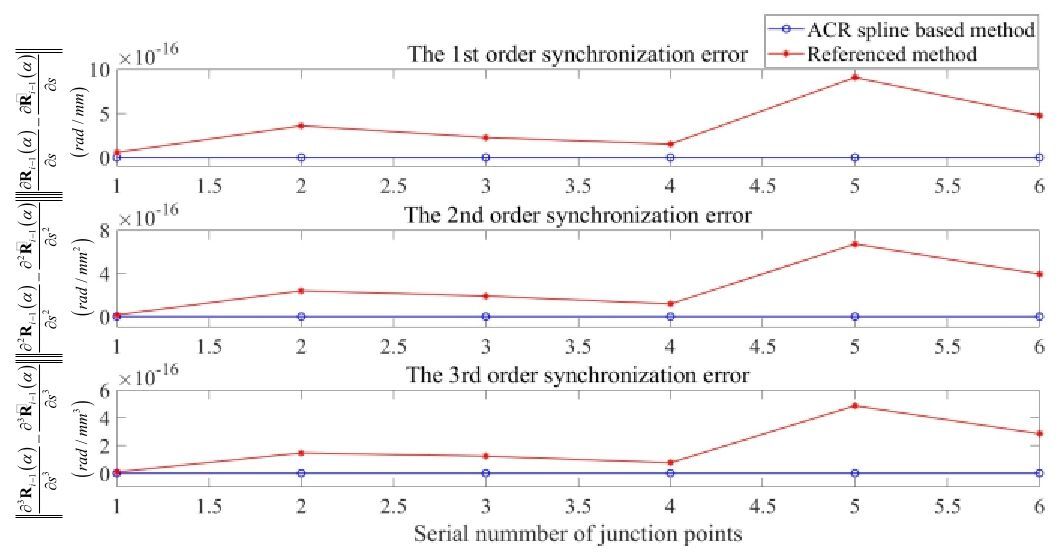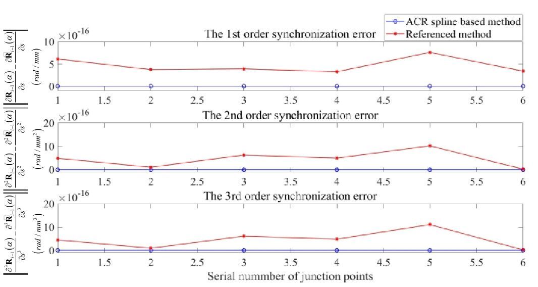 In Section 4, it is deduced that the synchronization errors of the tool orientation relative to the tool tip displacement at the junctions between curve splines and linear splines are identically zero. To verify this conclusion, the 1st-, 2nd- and 3rd-order synchronization errors at these junctions are computed, as illustrated in Fig. 11 and Fig. 12. For comparison, the synchronization errors of the smoothed tool path obtained using the method described in [29] is also evaluated on the same test tool path. The results clearly indicate that the synchronization errors of the tool path smoothed by the developed ACR-spline-based method are zero at all examined orders, whereas the method in [29] yields non-zero errors. This outcome verifies the C3 continuous synchronization of the tool orientation with respect to the tool tip displacement achieved by the developed method.