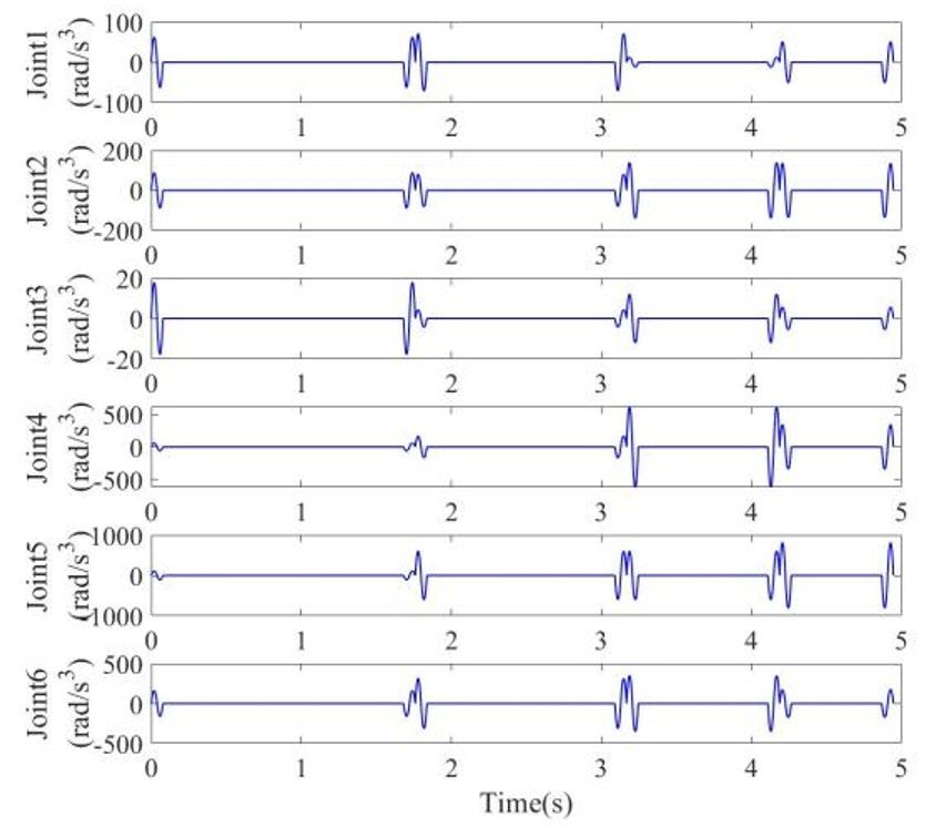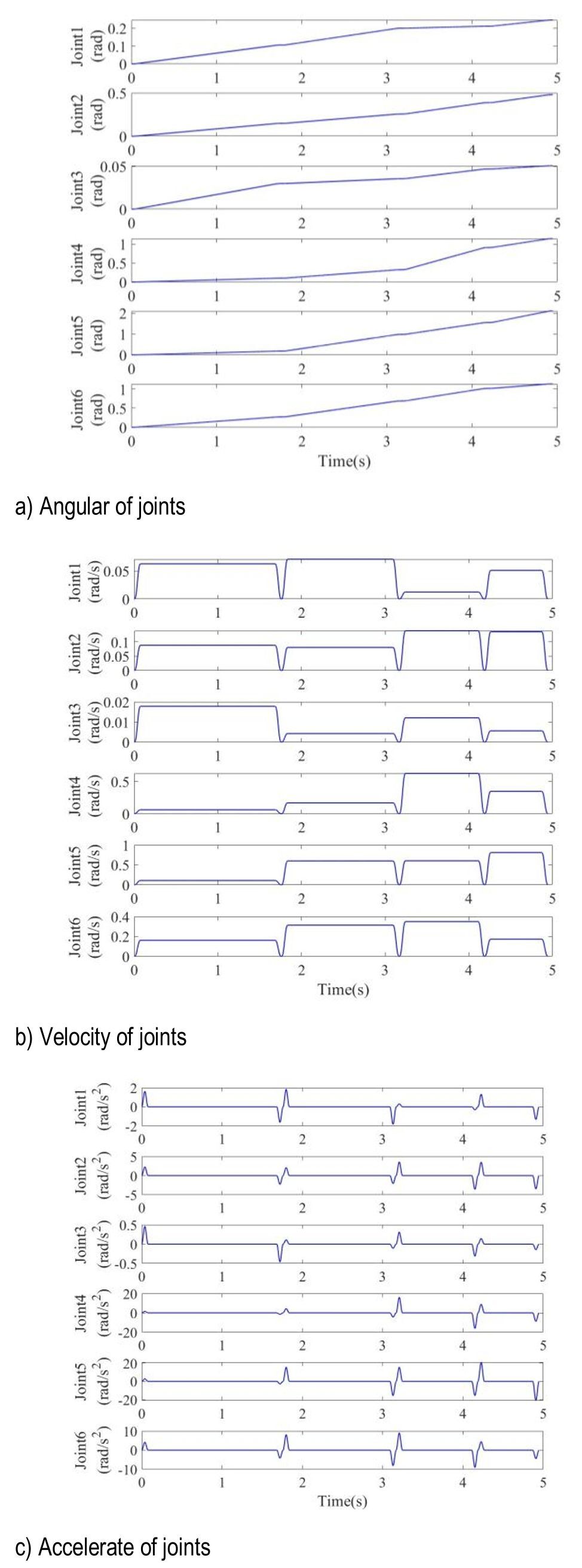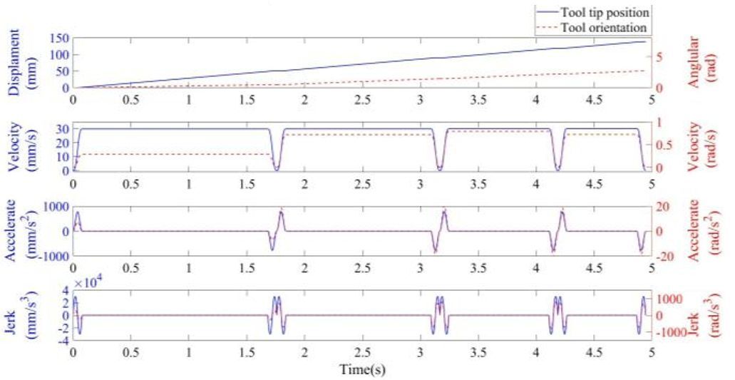 Furthermore, Fig. 14 illustrates the kinematic profiles for each joint, clearly demonstrating that the motion of every robot joint maintains third-order continuity without any abrupt changes in jerk. This observation further substantiates the effectiveness and practical applicability of the developed tool path smoothing method.