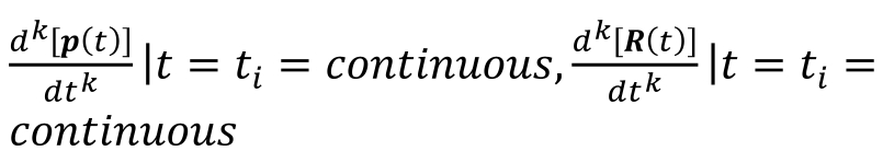 – Compatibility with arc-length reparameterization and feedrate/jerk control. Because analytic derivatives are available, ACR integrates readily with arc-length reparameterization and feedrate scheduling procedures to enforce curvature and jerk limits–facilitating construction of C3 continuous trajectories that are synchronized in both position and orientation.