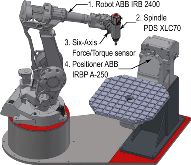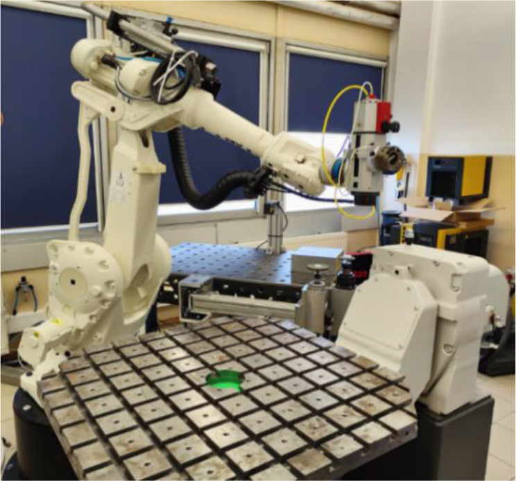In order to conduct research on the robotic automation of machining processes, a dedicated experimental setup was developed, as illustrated in Fig. 1 and Fig. 2. The core of the research station is the ABB IRB 2400 industrial robot, which is equipped with a six-axis force/torque sensor and a high-speed spindle unit. The station also includes a two-axis positioner for workpiece manipulation. The Tool Centre Point (TCP) of the robot is defined relative to the machining tool mounted in the spindle holder. Its spatial position is determined with respect to a coordinate frame attached to the robot's flange surface. The robot has been equipped with the Absolute Accuracy option, which means that it has been additionally calibrated to improve the TCP’s absolute positioning accuracy. The manufacturer provides a calibration (“Birth”) certificate specifying unit-specific positioning-accuracy metrics; the values for the robot used in this study are listed in Tab. 1. The ABB IRB 2400 used in this study is additionally equipped with the External Guided Motion (EGM) interface, which streams the full robot state vector (joint positions, velocities and controller-estimated actuator torques) at 250 Hz directly from the IRC5 controller. While positional accuracy is certified by the manufacturer, the actuator torques are not measured; they are computed online by the controller’s internal dynamic model and the associated uncertainty is not disclosed. Accordingly, torque values are treated as estimates.