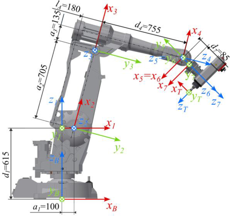 The coordinate frames used for the kinematic description of the ABB IRB 2400 manipulator, as well as the corresponding distances between them, are presented in Fig. 3. The dimensional and structural data were extracted from the manufacturer’s documentation [28].