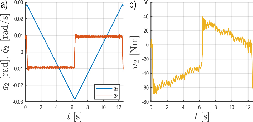 Fig. 8 presents the measured angular position, velocity, and actuator torque for joint 2, moving in both positive and negative directions at a velocity of