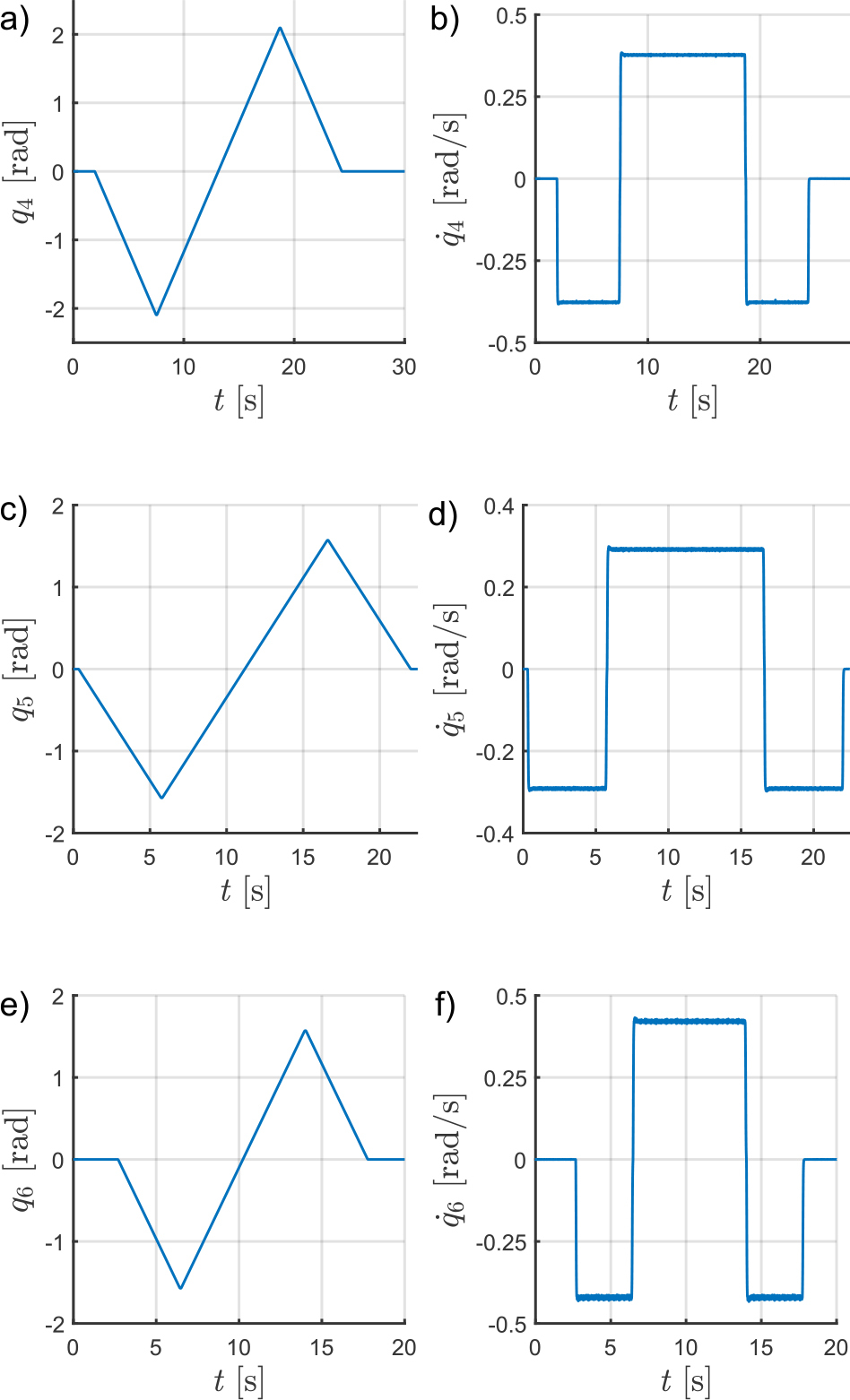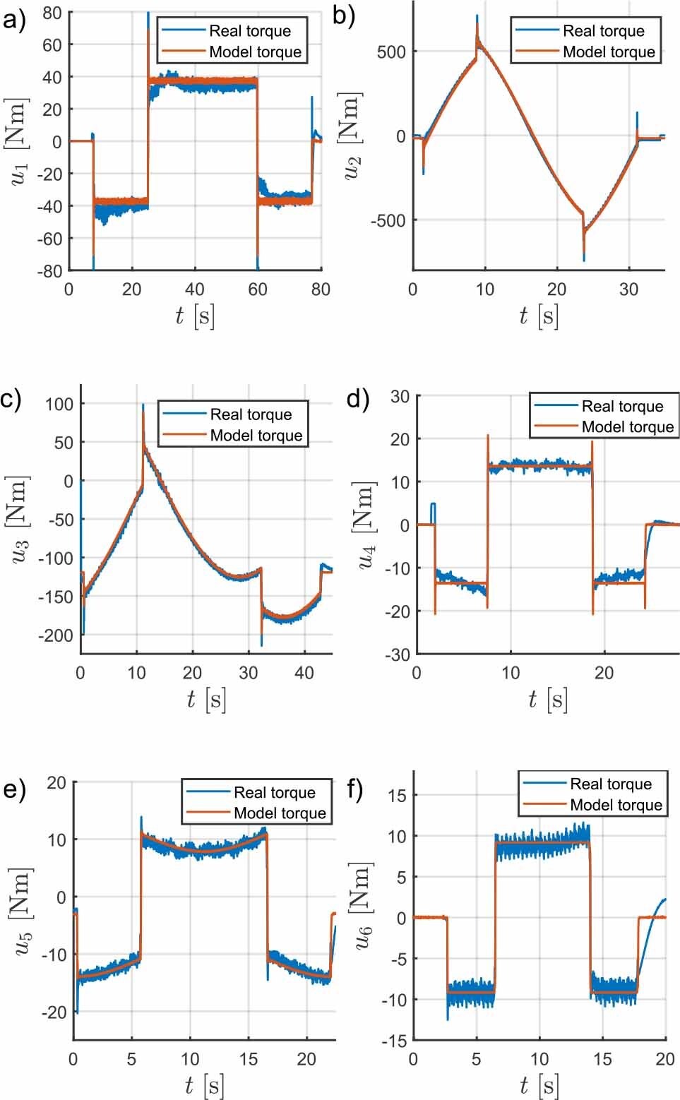 To validate the agreement between the robot model and the real system, the inverse dynamics problem was solved using motion data recorded from the physical robot. The computed actuator torques were then compared with measured values. Fig. 10 and Fig. 11 present the angular positions and velocities for all six joints used as simulation inputs. Fig. 12 shows the comparison of modelled and measured torques.