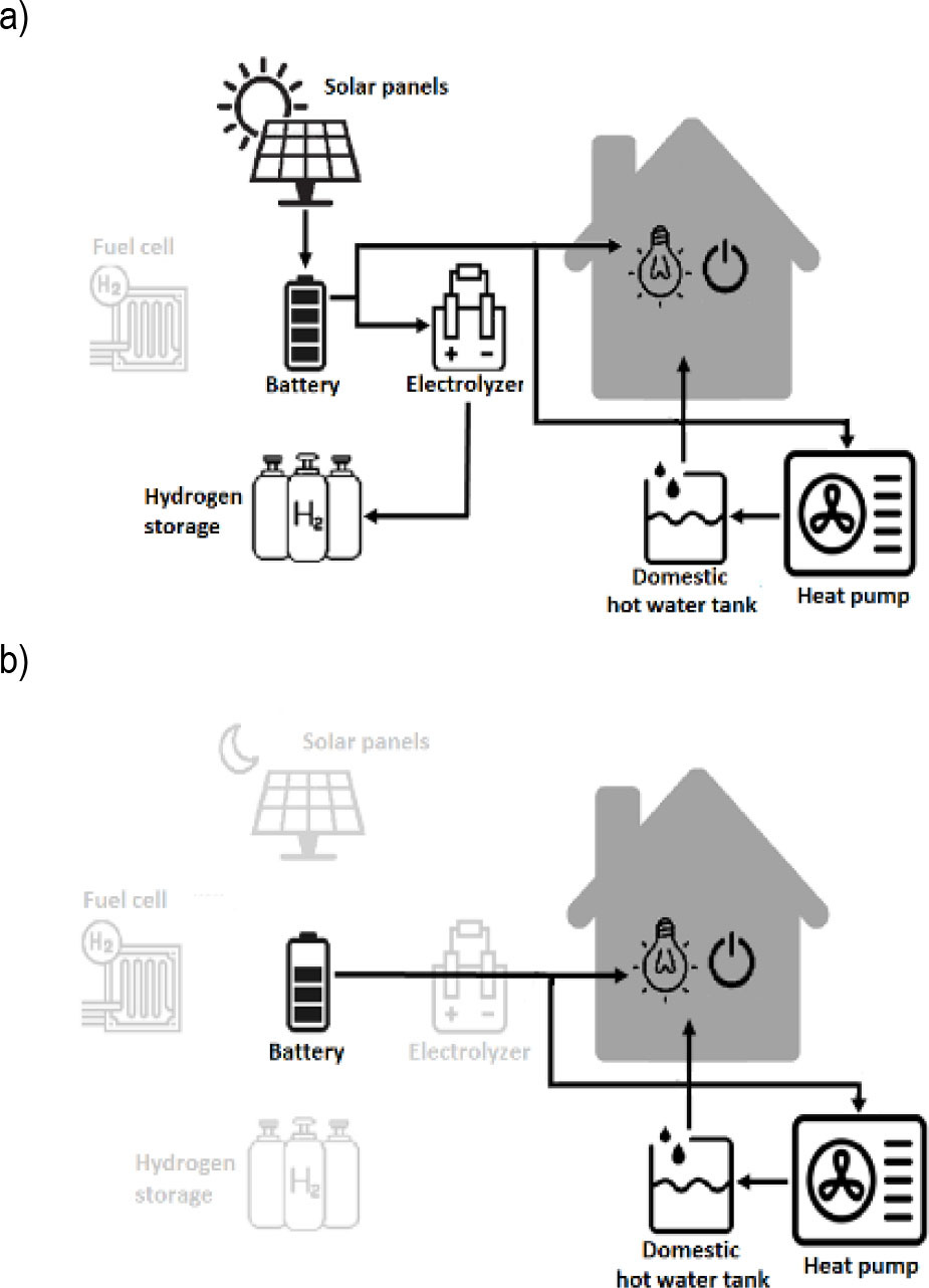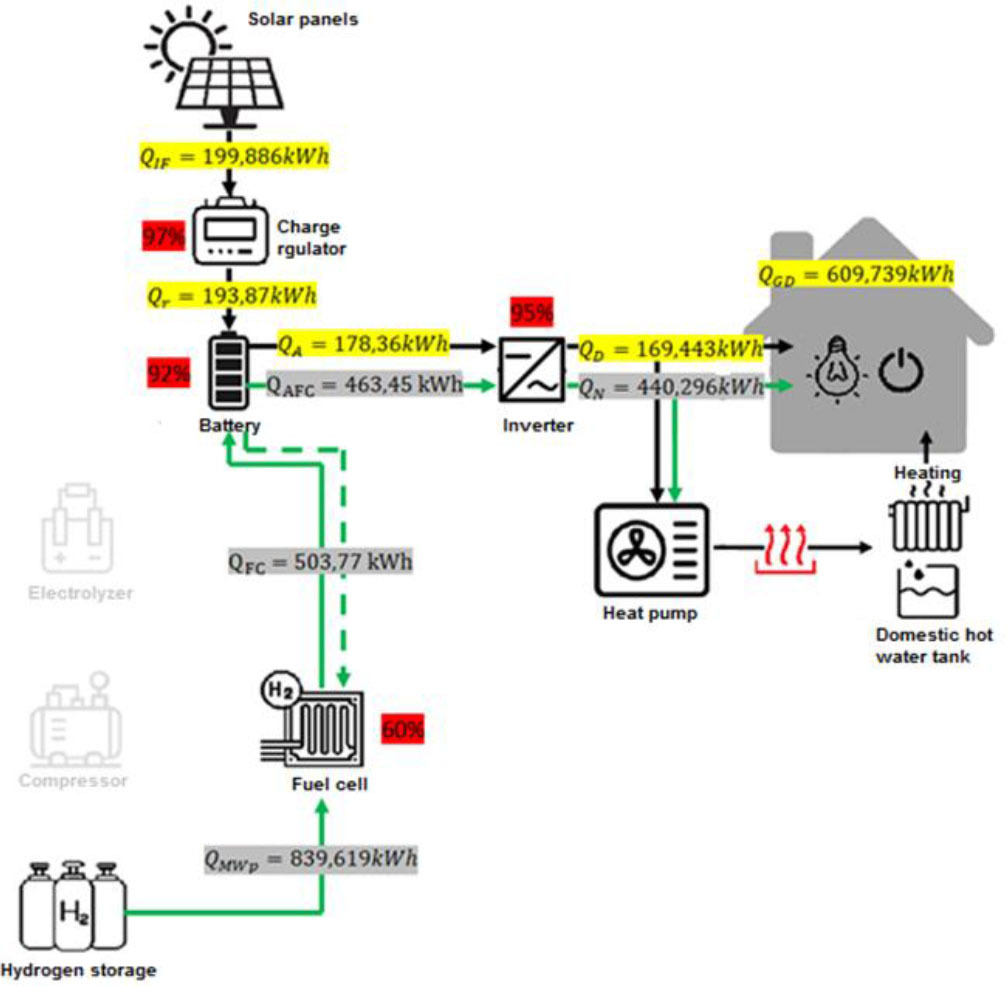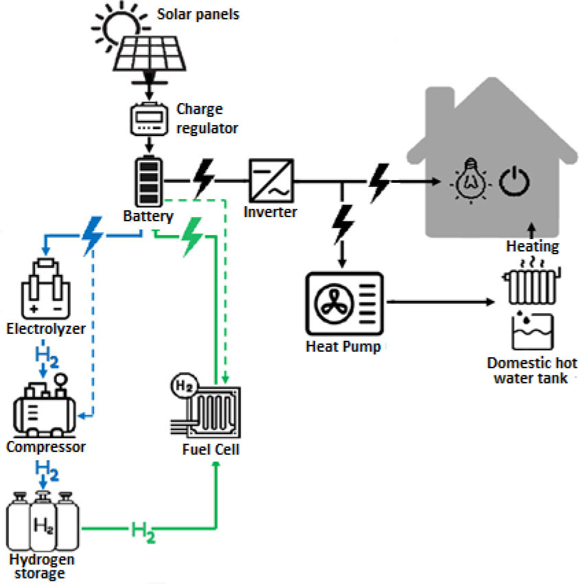 The installation scheme and its components for the considered house is shown in Fig. 1. The installation consists of an electric power generation system endowed with photovoltaic panels, a charge regulator, an inverter, a battery pack, an electrolyzer for hydrogen production, a hydrogen compressor, hydrogen storage tanks, a fuel cell for production of electricity and a heat pump. An air heat pump was used to reduce electricity consumption for heating the house and domestic water.