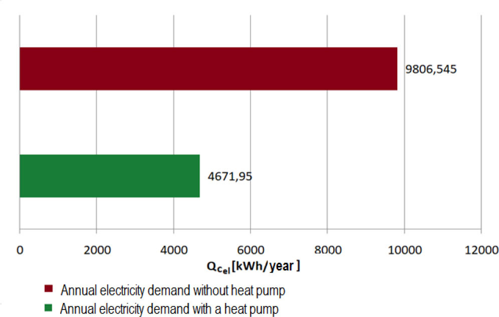 where: QC - annual total energy demand of the building [kWh/year], QCO - annual energy demand to heat the building [kWh/year], QCWU - annual energy demand for heating domestic hot water [kWh/year], Qel - annual electricity demand [kWh/year].The use of a heat pump with a SCOP coefficient of 3.26 allows to reduce the demand for electricity for heating the building and domestic hot water to 1717.79 kWh (30.7% less energy in comparison to heating without heat pump) per year and 554.15 kWh (30.7% less energy in comparison to heating without heat pump) per year, respectively. Fig. 4 shows comparing annual electricity demand in cases where the heating of the building and domestic hot water is provided by an electrical installation or a heat pump.
