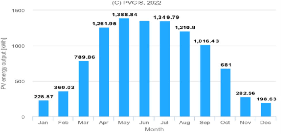 Based on the calculated demand for electricity, the power of the photovoltaic installation was estimated, taking into account the losses resulting from the aging of photovoltaic cells and energy conversion losses in the production and storage of hydrogen as well as loss related to the conversion of hydrogen to electricity in the fuel cell. In order for the designed system to meet certain assumptions, the total power of the modules should be 10.14 kWp. On this basis, a simulation was carried out in the PVGIS calculator, which determines the monthly production of electricity from the photovoltaic system located in Gdańsk. The results obtained for the photovoltaic installation are shown in Fig. 5.