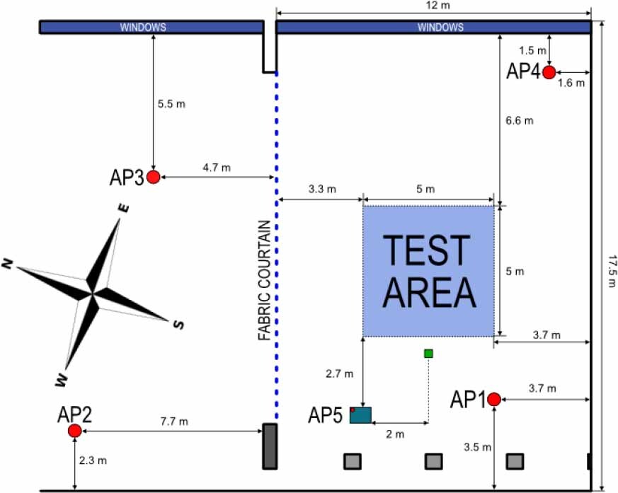 The experiment was conducted in the sports hall of the Bialystok University of Technology. Access points (APs) were randomly placed within the hall as shown in Figure 2. A total of seven access points were set up, two of which were located in the NLOS area. Four access points in the LOS zone were placed at a height of 2.5 m, one at height of the 0.7 m (on the table). Access points installed in the building were also used.