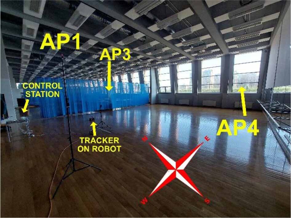 A picture of the experiment can be found in Figure 3. It illustrates the APs located in the LOS zone, the control station from which the entire experiment was managed, and the robot on which the tracker was mounted. One of the APs in the NLOS zone is depicted in Figure 4.