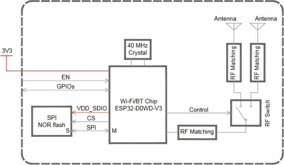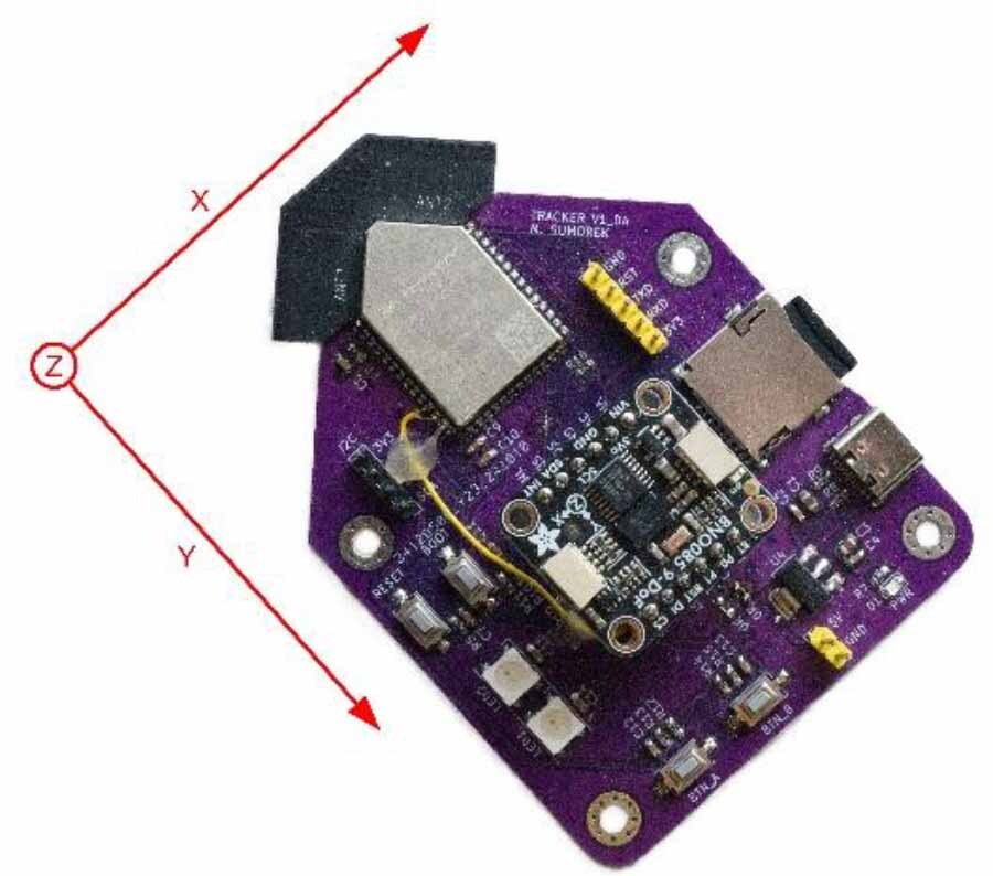 RSSI measurements were conducted with a proprietary tracker (Figure 5). It contained an ESP32-WROOM-DA chip that enabled Wi-Fi and Bluetooth connectivity [16]. As illustrated in Figure 6, this chip features an antenna array that comprises two antennas that can alternately function through an integrated RF (Radio Frequency) switch. The antennas are positioned at a 90-degree angle relative to each other. The device was also equipped with a BNO085 inertial measurement unit (IMU) with a 3-axis accelerometer, gyroscope, and magnetometer [17]. Furthermore, the chip was equipped with LEDs to indicate the operating status and a micro SD card slot, which enabled the storage of measurements on a memory card.