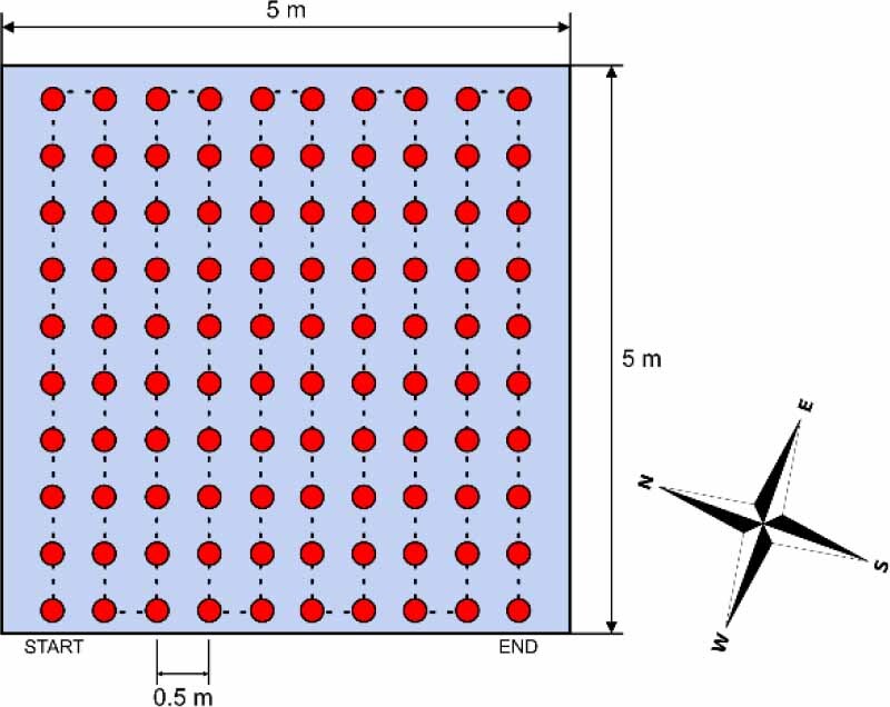 The training set was measured using a grid of 0.5 m spacing in a square measuring approximately 5 x 5 m (Figure 9). A total of 100 points were measured. Each point was measured eight times. Each measurement was performed with the robot in a different orientation, i.e., rotating approximately 45° around the Z axis. This resulted in approximately 10,000 unique raw data records. Test data was acquired by taking measurements at 14 randomly distributed locations within the test area (Figure 2). Eight measurements were taken at each location, with the mobile robot rotating between each.