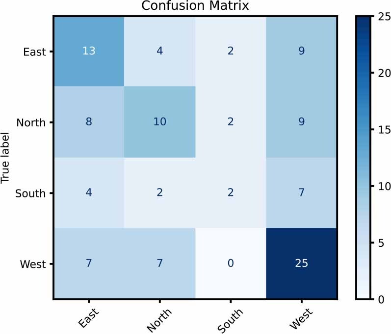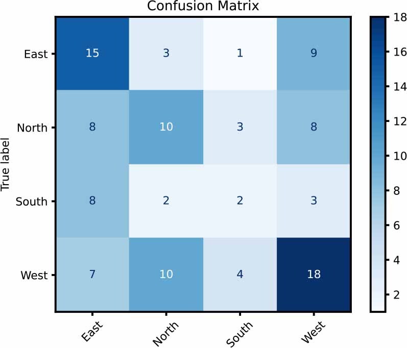 Analyzing the confusion matrix in Figure 11 demonstrates that the east and south directions were most frequently misclassified as west. In the north direction, the errors were evenly distributed among the classes. The direction of the west was most frequently misclassified as north.