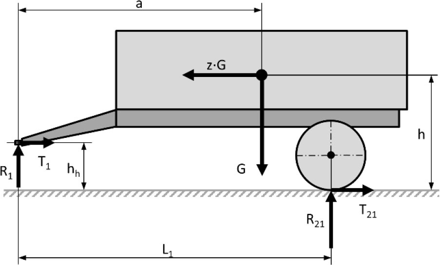where: Tf, Tr – front and rear axle braking forces, Rf, Rr – axle loads, T1, R1 – horizontal and vertical force on the coupling, Lt – inter-axle spacing, bt – distance between centre of gravity and rear axle, ht – height of the centre of gravity, Lh – distance from coupling device to the rear axle, Gt – trailer weight, z – braking rate.The equilibrium equations of forces and moments exerted on the single-axle semi-trailer shown in Fig. 2 are as follows: