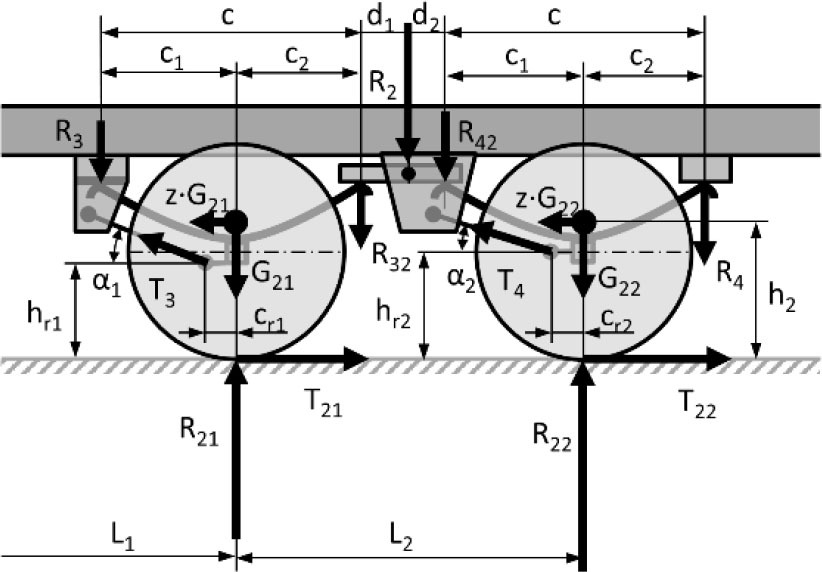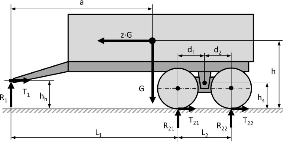 vertical reactions are obtained: where: d1 and d2 – beam length, hs – height of support position, L2 = d1 + d2 and L = L1 + d1.During ideal braking of the combination of tractor-semitrailer with tandem suspension, the adhesion utilisation of each axle is the same and equal to the braking rate: ff = fr = f21 = f22 = z, which means Tf + Tr = z(Rf + Rr) and T21 + T22 = z(R21 + R22). Then, the vertical reactions at the coupling and the wheels of the trailer are as follows: