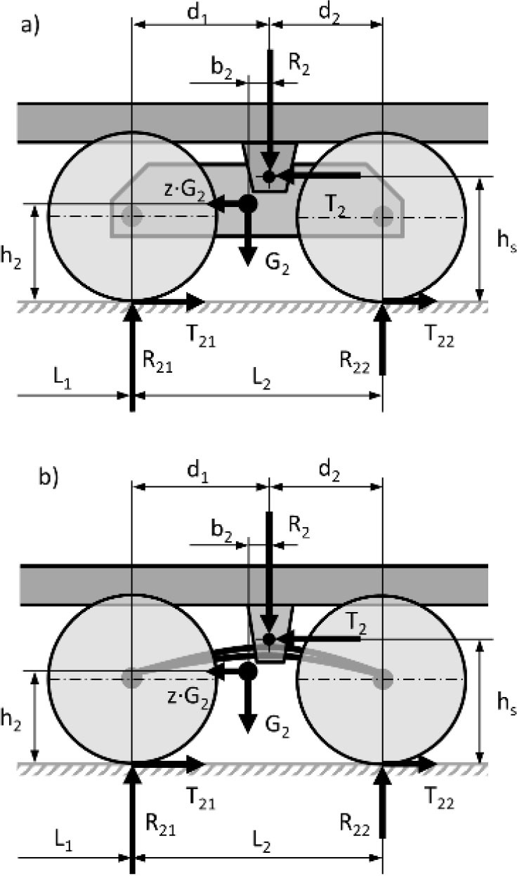 where: T2 and R2 – horizontal and vertical forces in the single-point support between the suspension and trailer frame, d1 and d2 – beam (parabolic spring) length, hs – height of position, b2 – distance of centre of unsprung weight from a support, h2 – height of centre of unsprung weight, G2 – unsprung weight.By solving the system of equations (17), (18) and (31) together, considering from equation (16) that T21 + T22 = z · G − T1, the dynamic axle loads and the vertical coupling force during braking of semi-trailer are obtained: