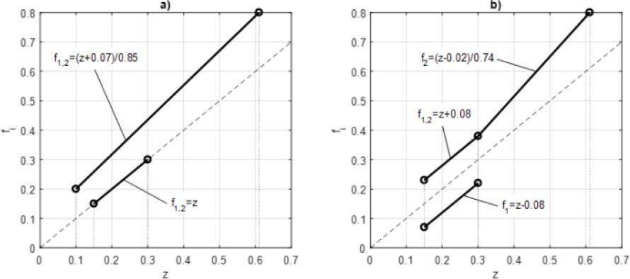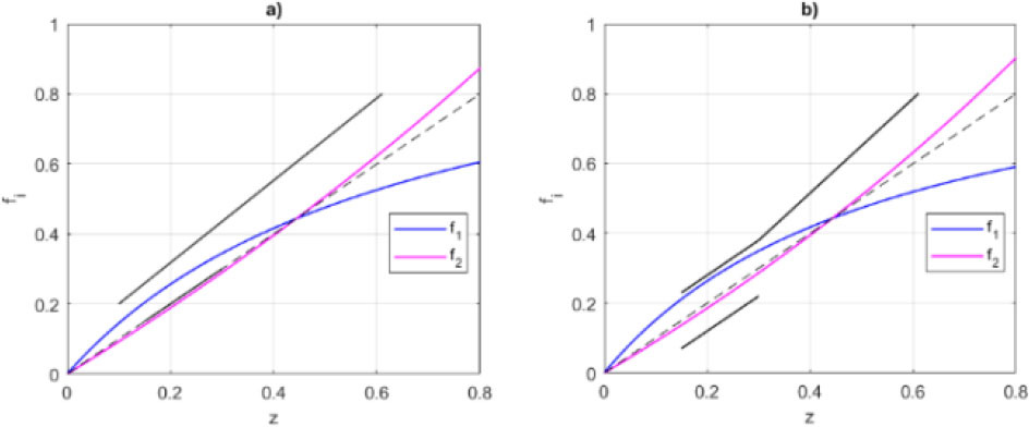 Adhesion utilization curves fi(z) for an optimal distribution of brake forces in a single axle semi-trailer: a – an unladen trailer (I solution), b – a laden trailer (II solution)