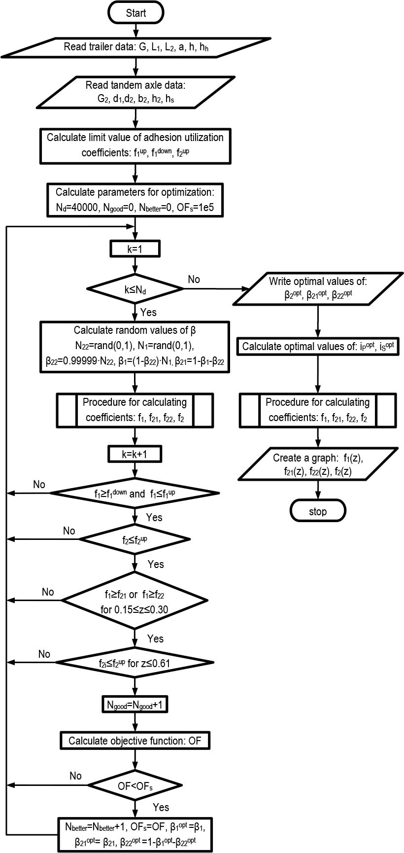 A block diagram of an algorithm for the optimization of brake forces of a semi-trailer with tandem suspension using the Monte Carlo method (OFs ‒ initial value of the objective function, Nd ‒ number of draws, Ngood – number of good solutions, meeting inequality constraints, Nbetter ‒ number of better solutions, reducing the value of the objective function)