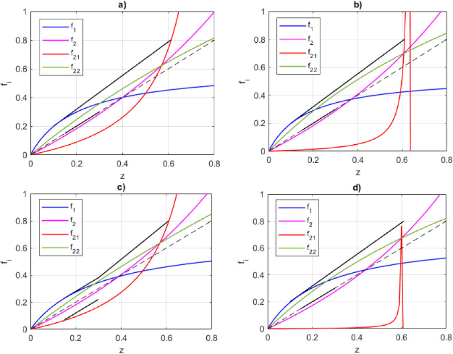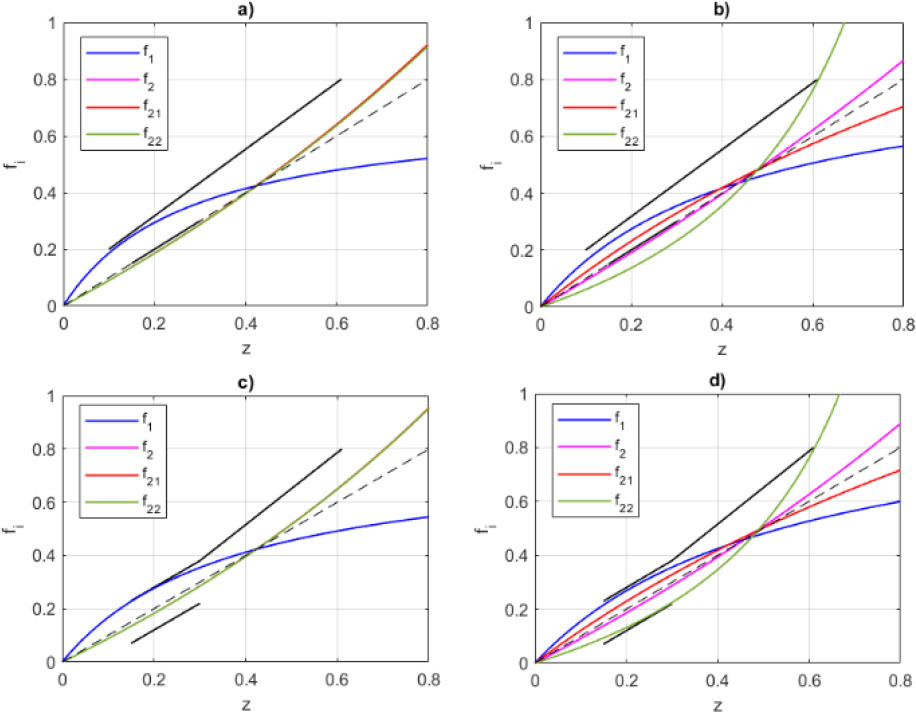 Adhesion utilization curves fi(z) for an optimal distribution of brake forces in a tandem axle semi-trailer (considering the weight of the tandem suspension): a – an unladen trailer with two leaf-two rod suspension (I solution), c – a laden trailer with two leaf-two rod suspension (II solution), b – an unladen trailer with two leaf suspension (I solution), d – a laden trailer with two leaf suspension (I solution)