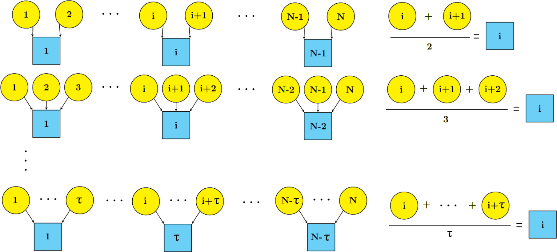 Multiscale Sample Entropy (MSE) [29] provides additional insight into different time scales for a complex time series. This modification introduces time scale factor τ. The original time series X = {x1, x2, …, xN} with N values needs recalculation using a so-called coarse-grain method, see Fig. 1.