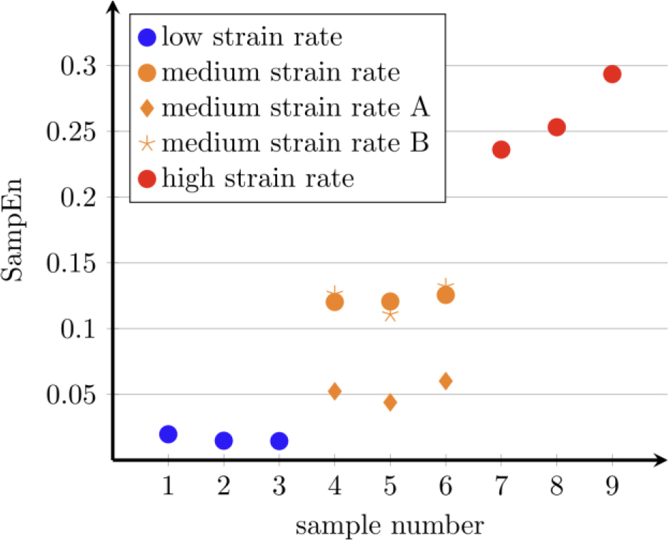 The results for Sample Entropy are summarized in two tables. In Tab. 5 the results for SampEn measure for the range marked by black lines in Fig. 3 are displayed. The samples number 1 to 3 are for the low strain rate, the samples number 4 to 6 are for the medium strain rate, and 7 to 9 for the high strain rate. In Tab. 6 the results for the medium strain rate for two sets of data ranging from 3 s to 13 s (SampEnA) and from 32 s to 42 s (SampEnB) are shown. The distinction is made to check if the values of Sample Entropy differ and are consistent with DIC observation (first type A and then B). The results are summarized in Fig. 4.
