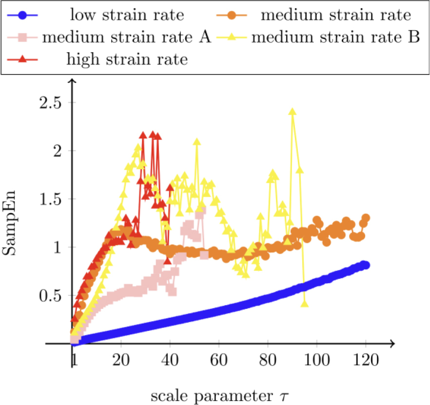 In the case of [16] MSE for C type bands behaves in a similar way to low strain rate (also identified as C type bands) when the complexity slightly rises (note that the authors of [16] calculated MSE for a scale factor below 21). In [16] for B type bands MSE first rises then drops and for A type bands MSE first drops then rises with some fluctuations. The B type behavior is similar to medium strain rate from this article without fluctuations. Different behavior for A type bands (in this article line is rising) can be caused by different frequency with which the signal is saved.