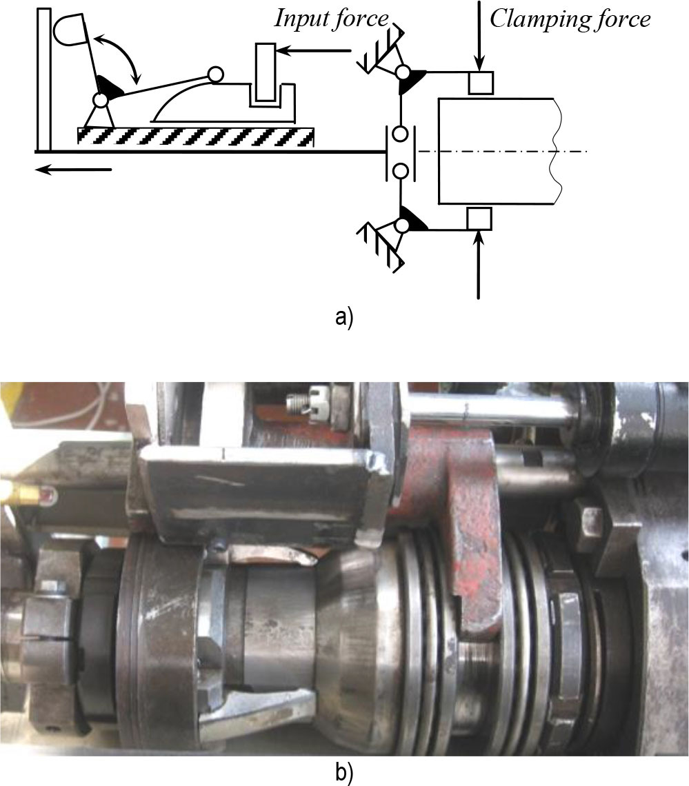 Mechanical CM’s actuator with geometric locking: a) functioning scheme in combination with a lever chuck (in the “clamped” state); b) general view of the mechanism (in the “unlocked” state)