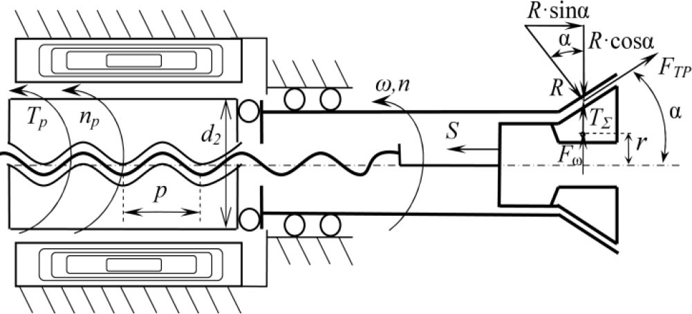 Axial force S, which is transferred from the rotor through the drawbartube to the collet, is counterbalanced by reactions of the spindle and clamping forces. To calculate parameters of the screw gear, the forces acting on the surface of the thread are conditionally replaced with concentrated force that is normal to the surface of the thread profile. Taking into account the small angle of the thread profile γp, we count it they are coaxial with the axis of rotation and with S. Tangential force Ft which must be applied to the rotor on its radius to obtain the required amount of axial force S is determined from: