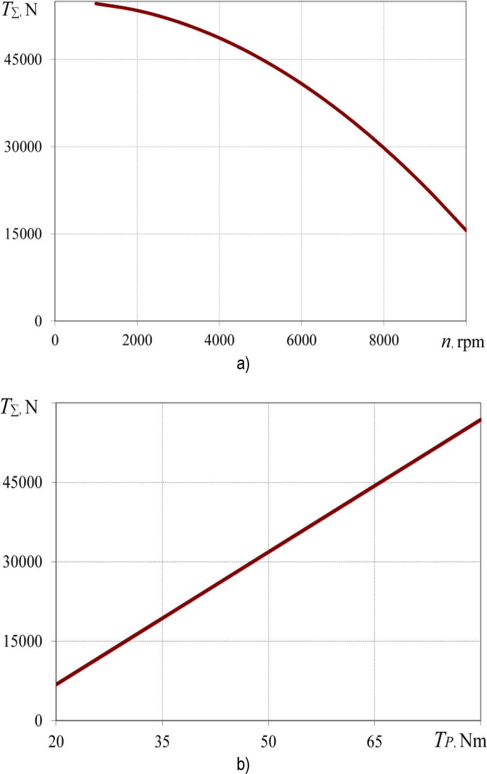 Dependence of clamping force TΣ in proposed CM from: a) frequency of rotation of the spindle n when the torque of the rotor of Тр = 66 Nm; b) torque Тр, which appears on the rotor at frequency of the spindle rotation n = 5000 rpm