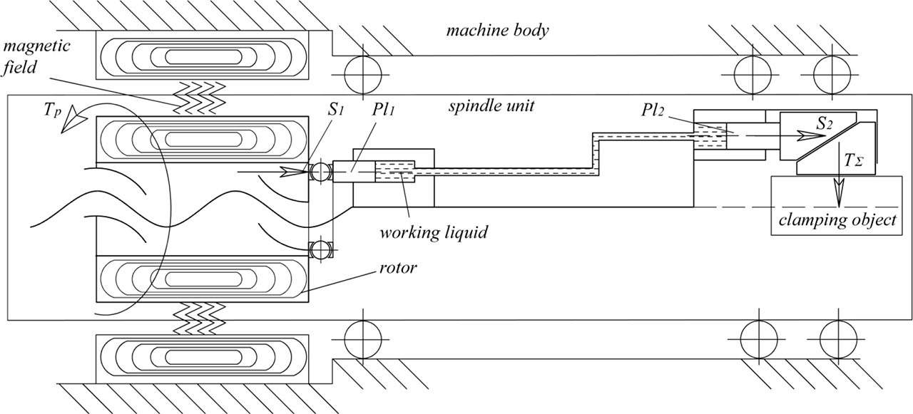 The graph in Fig. 4b shows the need to create a relatively large torque on the rotor of the CM drive of the proposed design. This indicates the expediency of further studying the possibilities of using another type of electric motor with a design of active parts adapted to increase the torque and, in particular, the type of windings. Also, the solution to this problem may be the use of additional converters of mechanical energy characteristics in the CM structure, for example, hydraulic ones. For example, a general scheme for the implementation of this principle of energy transmission and conversion in CM is proposed (Fig. 6). The axial force S1 from the rotor is transmitted to the hydraulic system plunger Pl1 which has a smaller diameter. It causes a pressure of working liquid and the appearance of a greater force S2 on the larger diameter plunger Pl2 that is supplying the inlet of the clamping chuck. This will make it possible to transfer mechanical energy from the clamping drive to the clamping chuck without using a drawbar tube with the amplification effect. Also, one of the most promising ways to obtain high values of torque on the motor rotor is to use vector control (field-oriented control) by an electric motor. This method requires the development of a detailed mathematical model of the clamping mechanism to be used as part of the motor control system. It gives the benefit of fine-tuned motor speed and torque control.