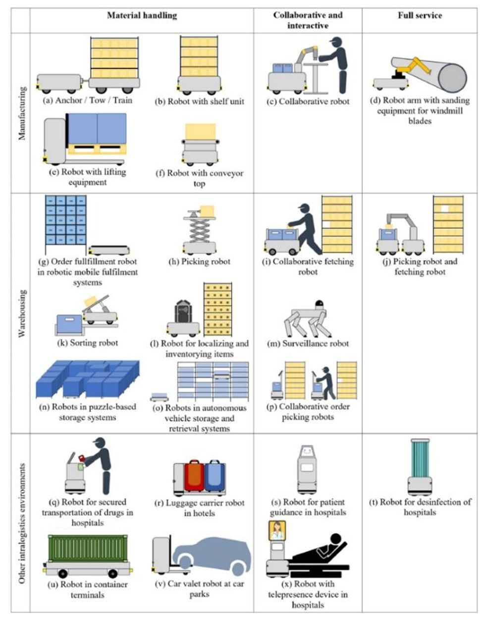 AMRs are increasingly revolutionizing transportation and distribution processes within logistics and supply chain management, particularly under the framework of Industry 4.0 [61]. These robots utilize a combination of technologies such as sensors, computer vision, artificial intelligence, and wireless communication to autonomously navigate, transport, and distribute goods within warehouses, distribution centers, and across supply networks [62]. AMRs, such as delivery drones and ground-based robots, address the challenges of last-mile logistics by offering cost-effective and timely solutions. The integration of AMRs in transportation and distribution functions addresses several operational challenges, improving efficiency, accuracy, and safety [63].