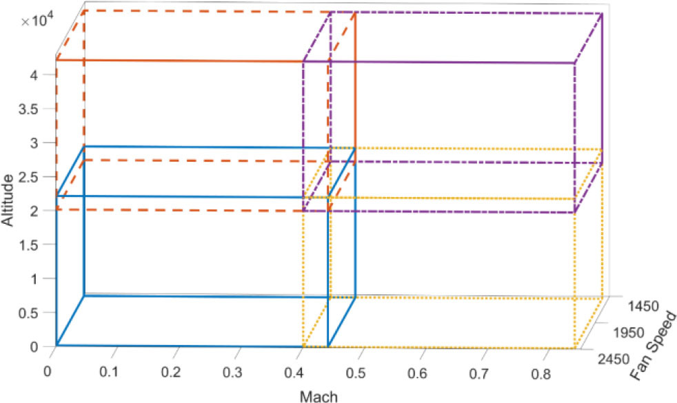 Here, the Mach number, the altitude and the fan speed parameters vary between [0 – 0.84], [0 – 42000] and [1497 – 2432] respectively. Using these parameters, the system has been partitioned into four intersecting cells, as illustrated in Fig. 2. Model parameters can be obtained for each vertex and cell according to [23].