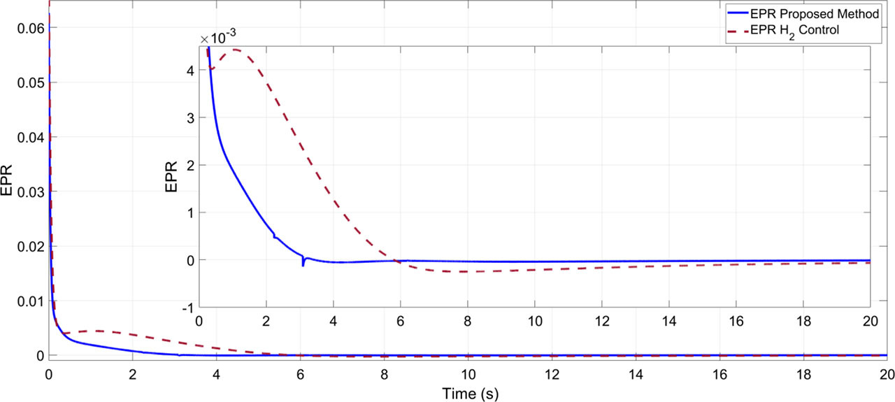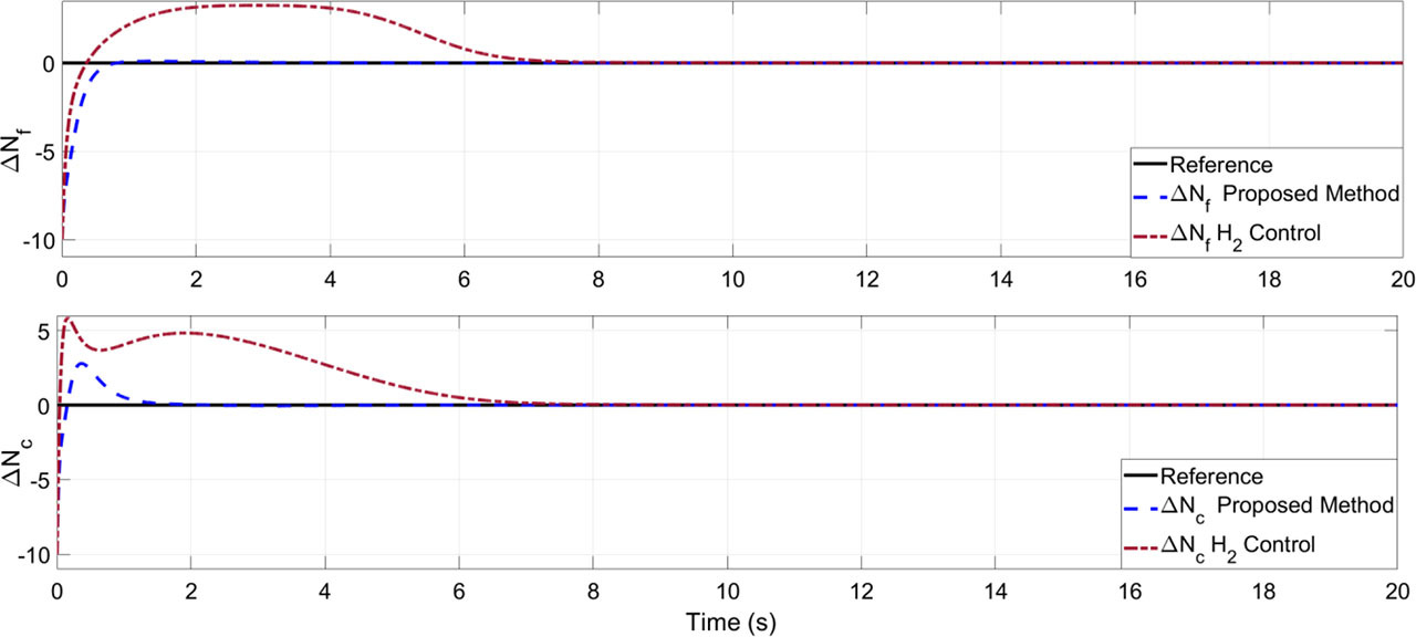 To analyze the effectiveness of the proposed control approach, a standard H2 controller is designed using the h2syn function in the MATLAB Toolbox. Two scenarios were examined for the standard H2 control approach. In the first scenario, the GE-90 aero-engine model was simulated using the standard H2 control without a disturbance estimation. The fan speed and core speed are depicted in Fig. 3, while the EPR increment for the GE-90 aero-engine is shown in Fig. 4. It is evident that the standard H2 control does not mitigate the disturbance effect. Next, the same model was simulated with the incorporation of the following disturbance observer: