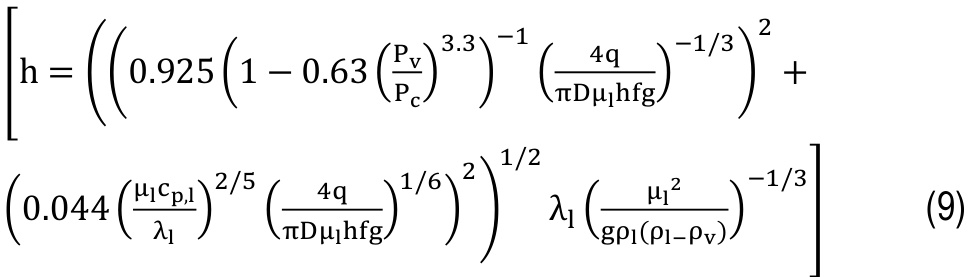Hashimoto and Kaminaga proposed a modified Nusselt-based model including corrections for heat flux and density ratio effects. The exponential term adjusts the heat transfer coefficient for variations in the liquid-to-vapor density ratio, reflecting changes in film behavior with fluid type and operating pressure. This modernized form combines analytical foundations with empirical adjustments, enhancing applicability to contemporary refrigerants and high performance condensation systems.