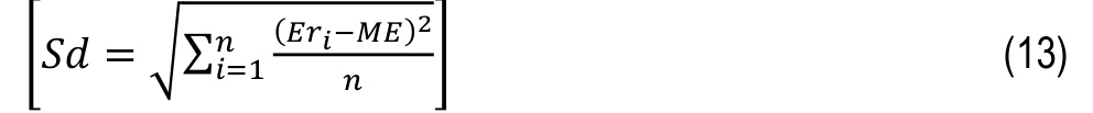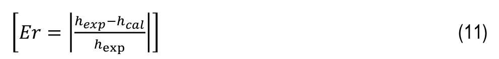 Both visual and statistical approaches are used to compare the values predicted by the correlations with those obtained experimentally. The visual approach involves evaluating the position of plotted points on the graphs relative to the median line. The statistical analysis, on the other hand, is based on the calculation of several error parameters: relative error (Er), mean error (ME), standard deviation of error (Sd), and correlation coefficient (𝑟), whose definitions are provided below: