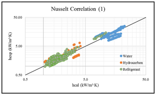 The predictions generally follow the experimental trends in Fig.1b, but with slightly more pronounced deviations water data series. Although r=0.96, the higher average error (17.10%) may reflect a limitation for specific conditions. This correlation is acceptable but slightly less precise than Nusselt's (1).