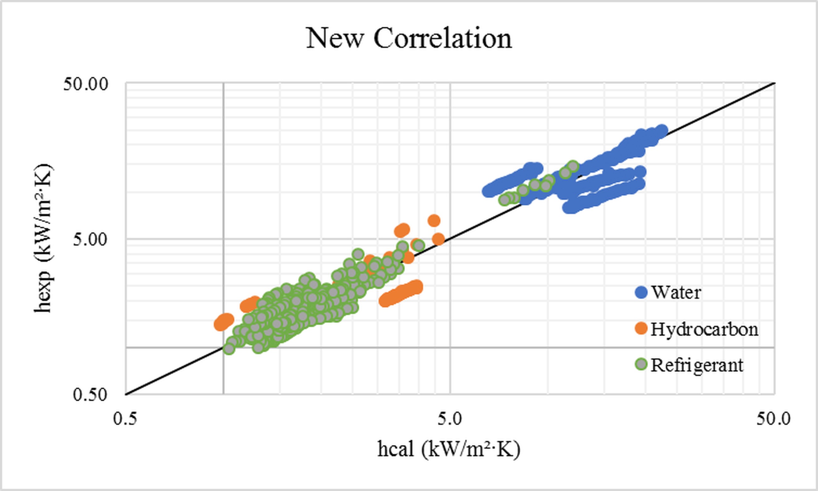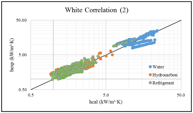 The graphical analyses in Fig.1a highlight a general trend that is consistently aligned around the median line, with small deviations between predictions and measured data for a series of hydrocarbon points and two series of water points. The correlation coefficient r=0.96 indicates a strong agreement between predictions and data, while a low average error (14.46%) confirms the accuracy of this correlation under the study conditions. Therefore, this correlation is reliable for predicting the heat transfer coefficient.