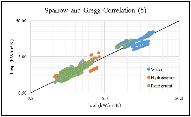 A new semi-empirical correlation (17) has been proposed, which provides very satisfactory results with a mean error of approximately 14% and a high correlation coefficient of 0.96. The newly developed correlation incorporates a refined functional dependence on the Jacob number, enhancing its predictive accuracy across diverse working fluids. This modification yields superior conformity with experimental observations, thereby underscoring the model’s robustness and its potential applicability as a reliable predictive framework for condensation heat transfer in engineering systems. Future work could further refine this model by incorporating additional factors such as the effects of surface material or mixed-mode condensation, which would increase its applicability to broader industrial scenarios, including condenser design and thermal system simulation tools. Moreover, the new correlation could be integrated into computational fluid dynamics (CFD) models to improve their predictive accuracy for practical applications.