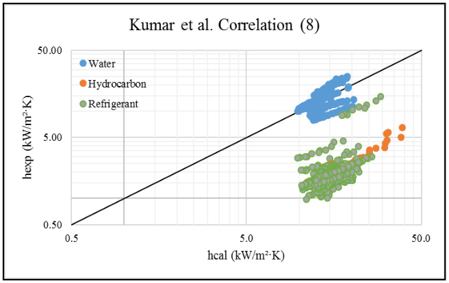 Kumar et al. proposed a purely empirical correlation based on curve fitting to experimental data over a range of operating conditions. The relationship between h and ΔT implicitly includes the combined effects of thermophysical properties, pressure, and geometry. While physically less rigorous, it provides a convenient predictive tool for practical applications under conditions similar to those tested experimentally.