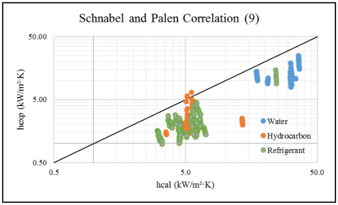 The Fig.1d presents a greater dispersion of points, with significant deviations from the experimental data. It is observed that all points lie below the median line, suggesting that the predicted values are higher than the experimental values. Additionally, a series of points corresponding to low-pressure data (below atmospheric pressure) is located above the median line, indicating that the predicted values are lower than the experimental values in these cases. The correlation coefficient (r=0.93) is slightly lower, and a high average error (31.85%) indicates a lack of precision. Therefore, this correlation seems less suitable for the collected data conditions. In calculating the heat transfer coefficient, the thermo physical properties of the fluid should be considered for a fluid temperature of Tf=Ts-0.69∆TTf=Ts-0.69∆T for each experimental point. However, given the large number of data points and the small difference between Tf and Ts, we opted to use the same value, Tf=Ts .