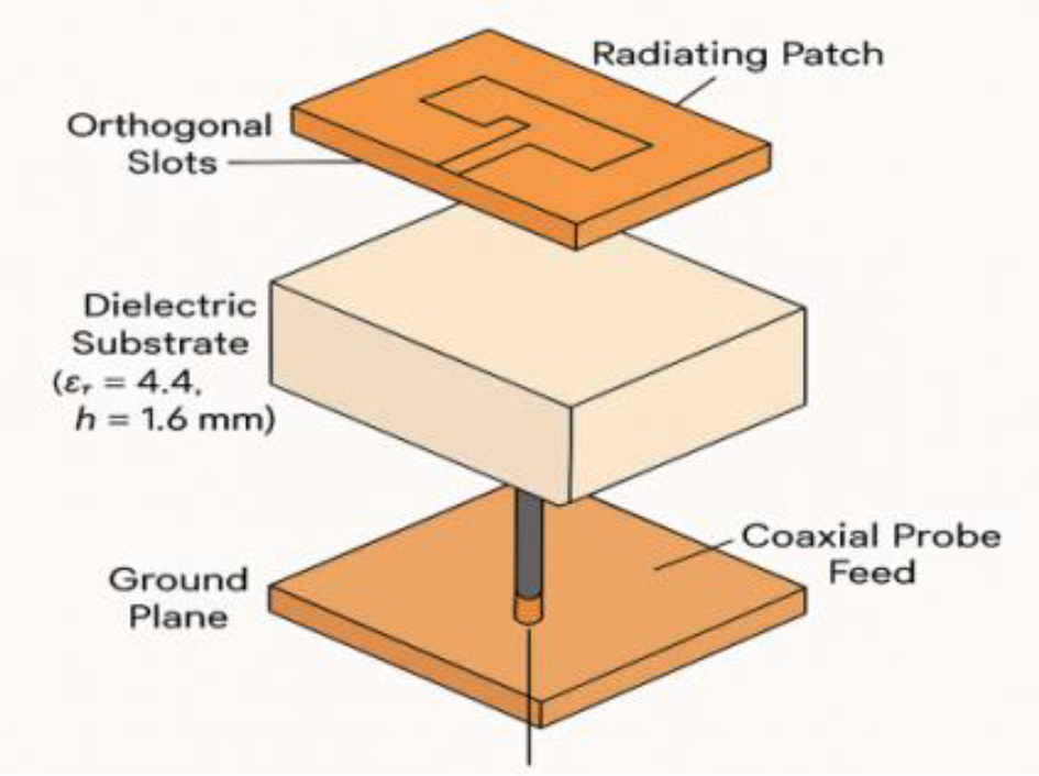 Radiating Patch: The antenna features a rectangular copper patch with strategically etched L-shaped slots. These slots create multiple current paths, enabling multiband operation by exciting different resonant modes [1][2].