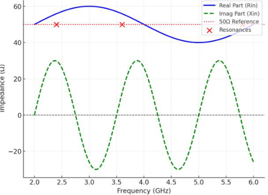 At resonance, the imaginary component becomes nearly zero (Xin ≈ 0) and the real component approaches 50 Ω, ensuring good matching with the feed line.