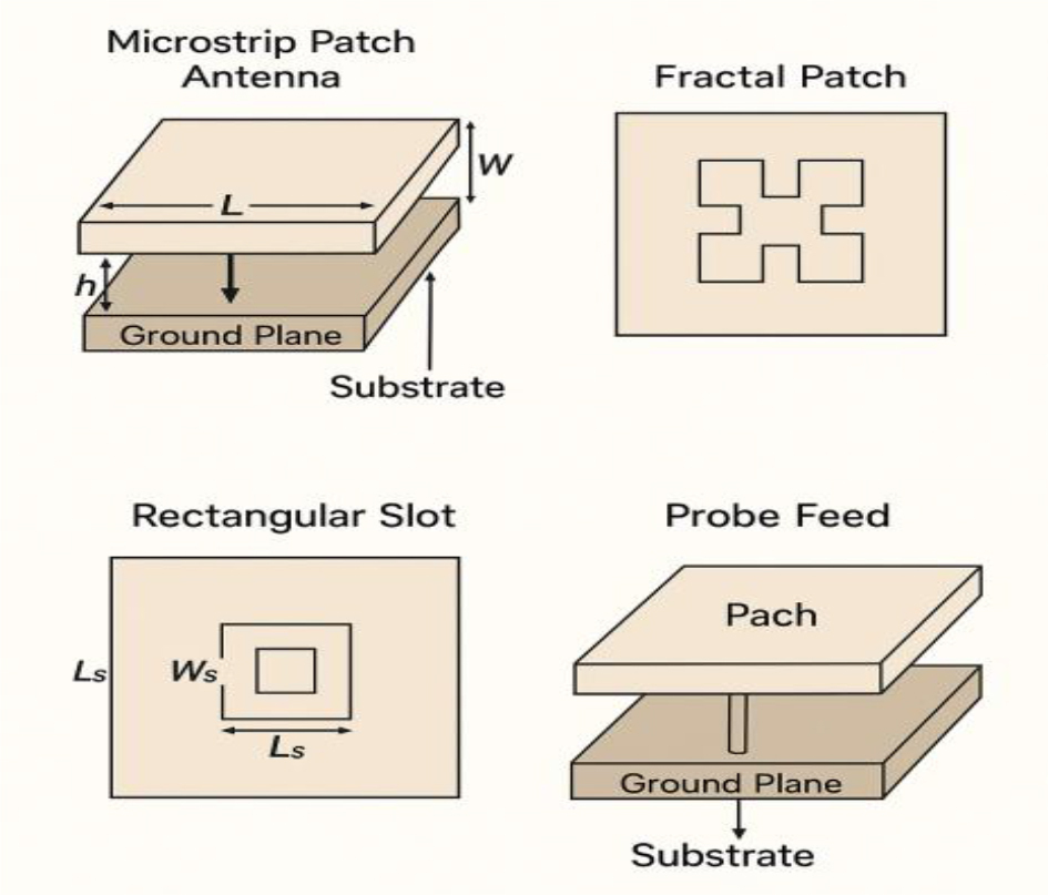 – Slotted Patch: Cutting slots of specific dimensions and shapes in a single patch can introduce multiple resonant frequencies. The dimensions and placement of the slots determine the new resonant modes[2].