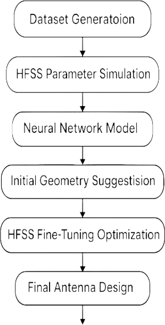 This section outlines the complete workflow used in the design and optimization of the proposed multiband microstrip patch antenna (MPA), integrating both computational electromagnetics (via HFSS) and data-driven optimization (via neural networks).