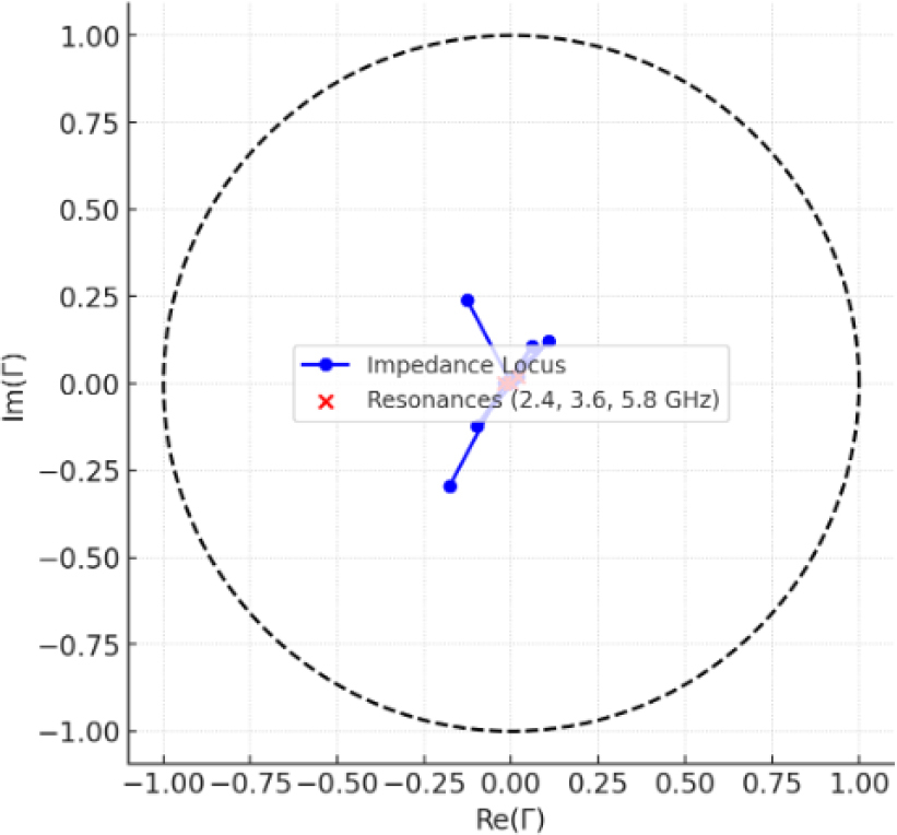 The Figure 6 shows that at 2.4, 3.6, and 5.8 GHz, Rin remains close to 50 Ω while Xin crosses zero, coinciding with the minima of S11 and VSWR < 2. The Smith chart (Figure 7) further confirms this behavior, with the impedance loci passing near the chart center at each operating band. Below resonance, the antenna is capacitive (Xin<0), while above resonance it becomes inductive (Xin > 0). These results verify proper impedance matching and efficient radiation across all target frequencies.