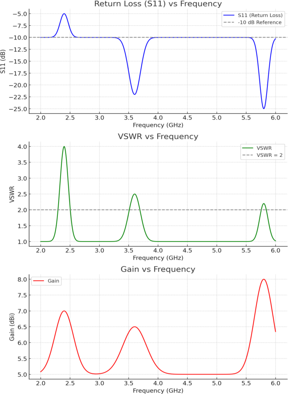 The figure 4 presents the simulated performance metrics of the proposed multiband microstrip patch antenna.