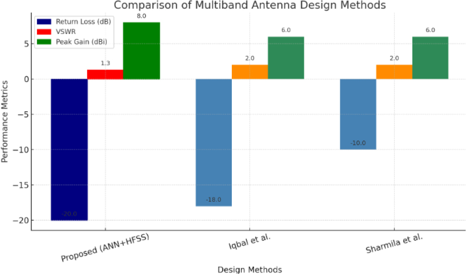 The performance of the proposed multiband microstrip patch antenna is evaluated through full-wave simulations in Ansys HFSS. The results confirm successful resonance at the target frequencies with acceptable return loss, gain, VSWR, and efficiency across all bands. Additionally, a comparative assessment highlights the superiority of the ANN-assisted HFSS optimization over conventional methods.